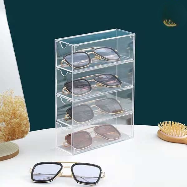 - Làm nổi bật sản phẩm: Nhờ bề mặt trong suốt và khả năng phản chiếu ánh sáng, kệ mica giúp từng mẫu kính trở nên thu hút, nổi bật hơn so với việc đặt trực tiếp trên bàn hay giá thông thường.