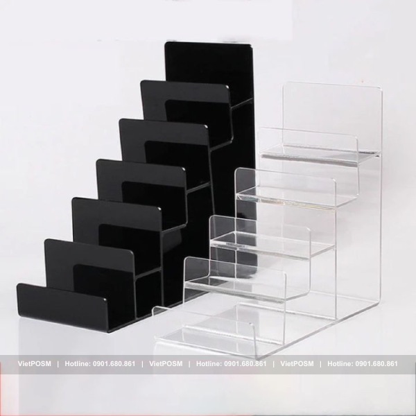 Được chế tạo từ mica trong suốt, chất liệu có độ bền cao, truyền sáng tốt. Loại kệ này vừa đảm bảo tính thẩm mỹ vừa chịu được va chạm nhẹ trong quá trình sử dụng. Mỗi sản phẩm được tạo hình bằng công nghệ cắt laser và uốn nhiệt hiện đại, sau đó ghép nối bằng keo chuyên dụng để tạo nên kết cấu chắc chắn nhưng vẫn dễ dàng tháo lắp khi cần di chuyển hoặc vệ sinh.